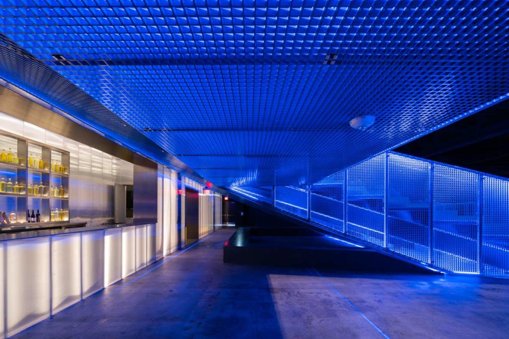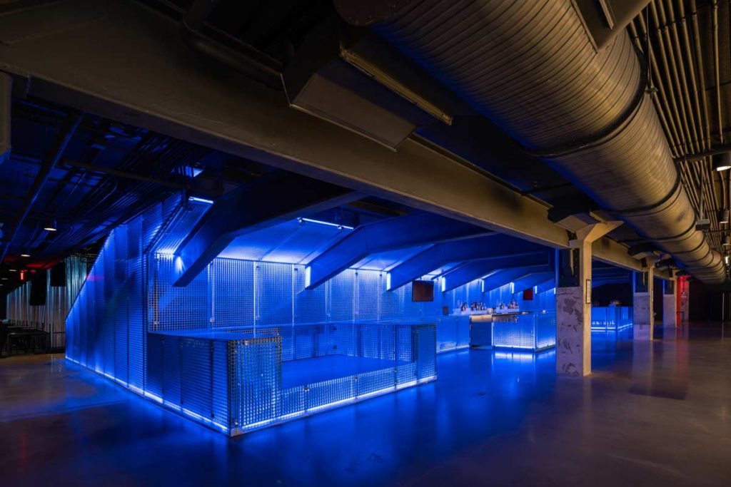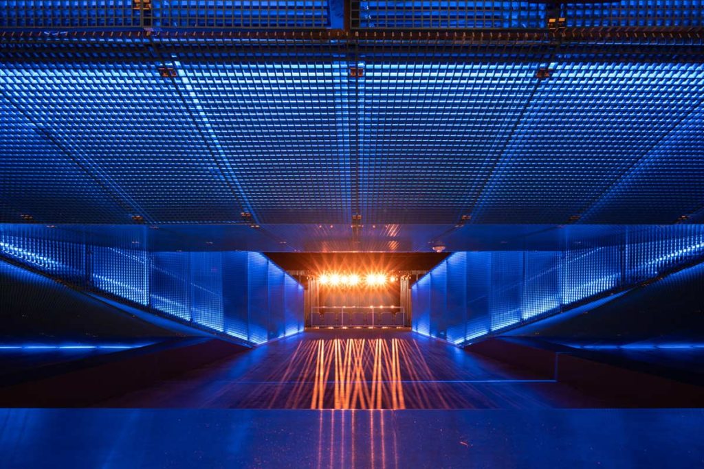 Einkaufs- und Veranstaltungszentrum in einem alten Postgebäude mit blauen Gitterrosten, die durch Lichteffekte besonders illuminiert werden.